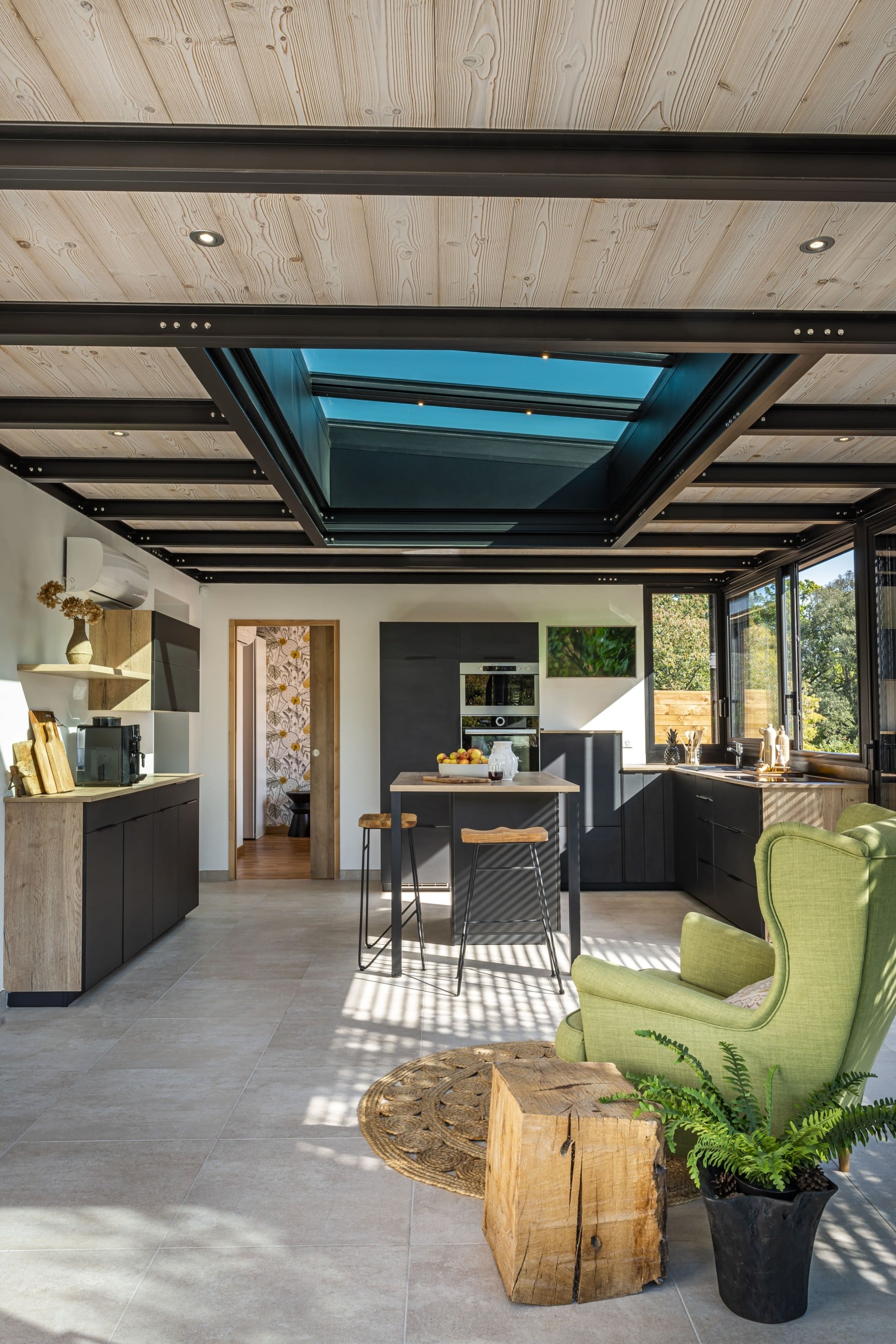 Une extension vitrée Extanxia favorise la continuité entre intérieur et extérieur. Les grandes surfaces vitrées, les profilés fins et les puits de lumière intégrés permettent de faire entrer pleinement la clarté et vous offrent une vue dégagée sur votre jardin.