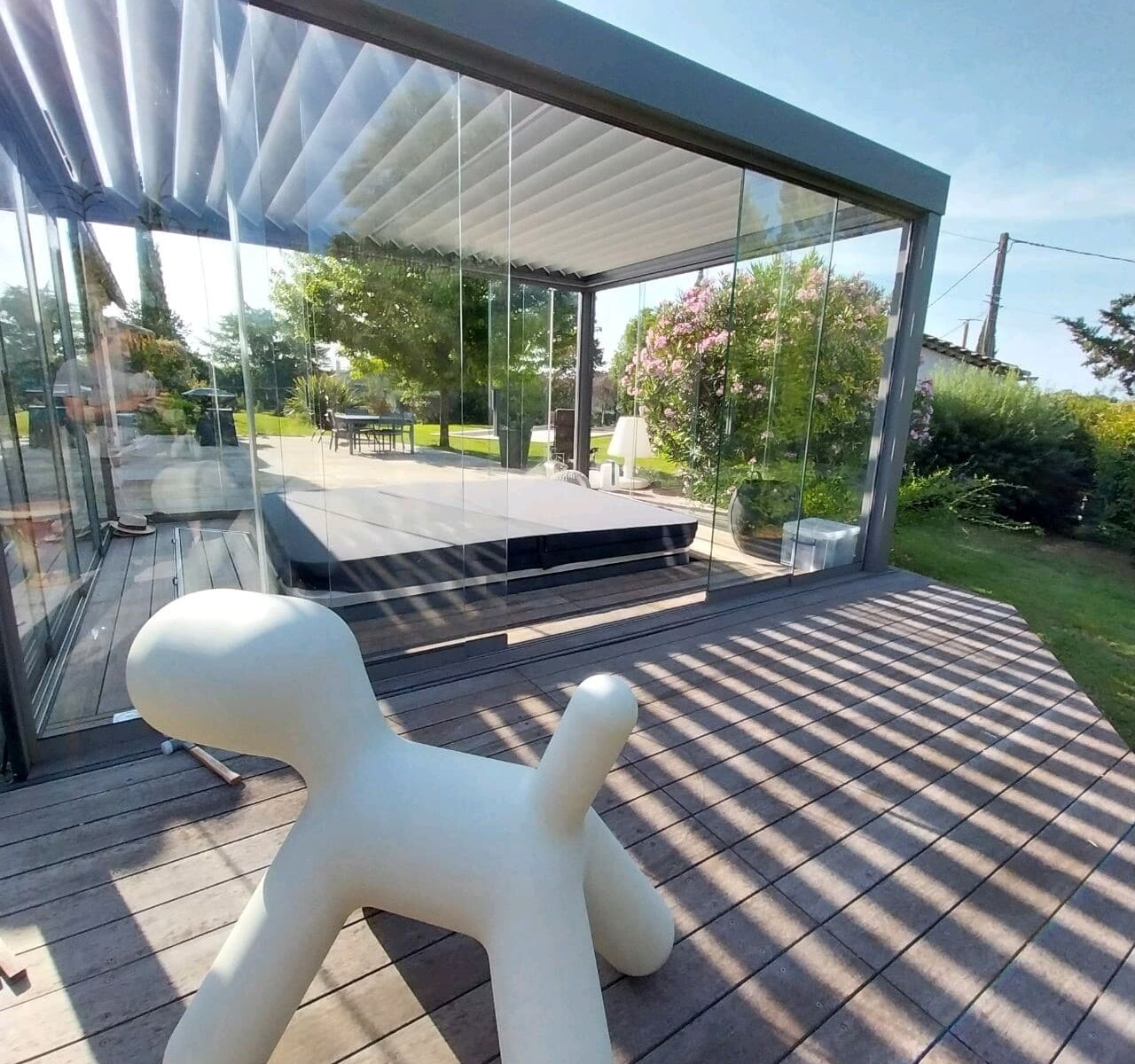 Disfruta de la pérgola incluso cuando hace mal tiempo, gracias a la corredera acristalada.