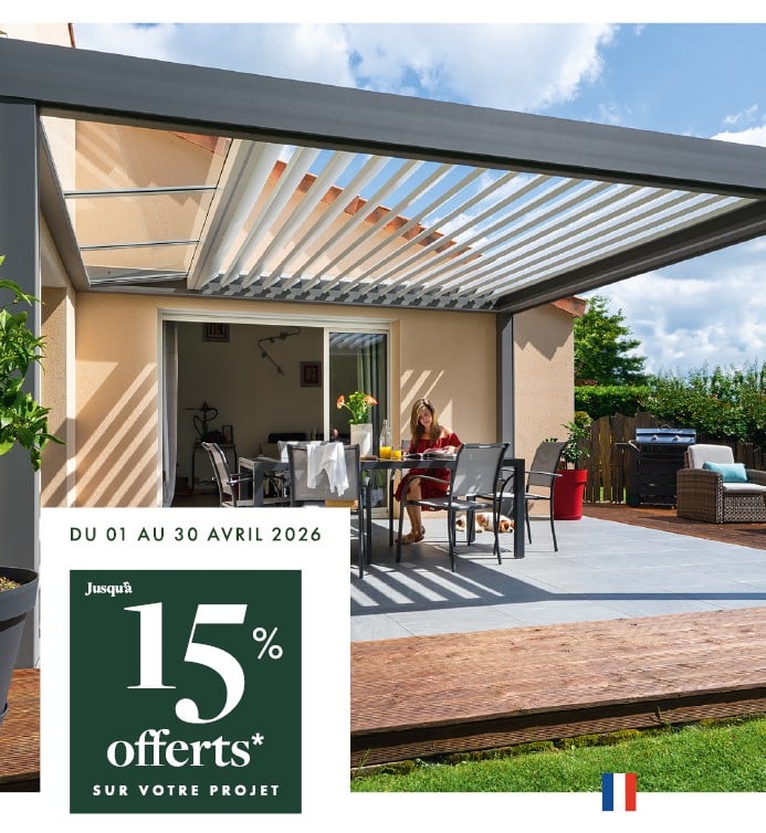 Du 1er au 30 Avril 2026, jusqu’à 15% offerts sur votre projet* d’extension, véranda, et pergola durant le mois d’Avril.