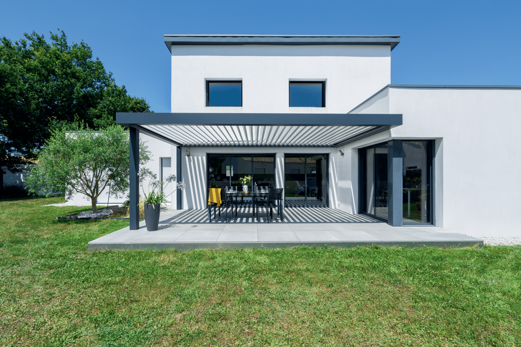 - Un large choix de toitures : lames orientables motorisées pour ajuster ombre et luminosité, panneaux opaques, toiture vitrée ou mixte