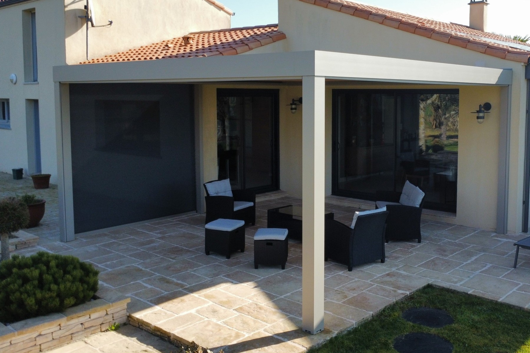 - Coulissant de verre : permet de laisser entrer la lumière, vous offrant en toute saison un espace lumineux et à l’abri pour profiter pleinement de votre pergola.